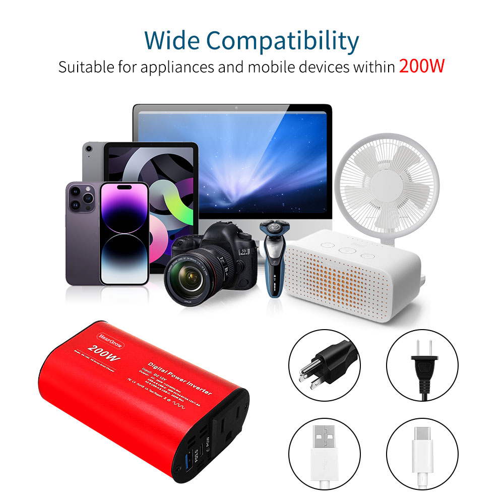 Home Inverters & Chargers HearGrow 200W Red Car Power Inverter Car Adapter DC 12V to AC 110V PD 20W and QC 3.0 18W 4.2A Dual USB Car Charger Adapter and Cigarette Lighter Socket